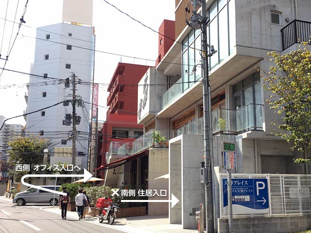 南向きの住居スペース入口からオフィスには入れませんのでご注意ください。