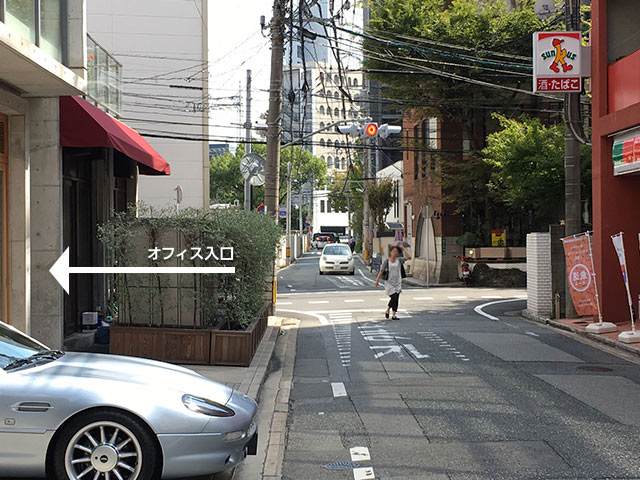 オフィス側入口は、ANDONの西側にあります。向かいのコンビニが目印です。